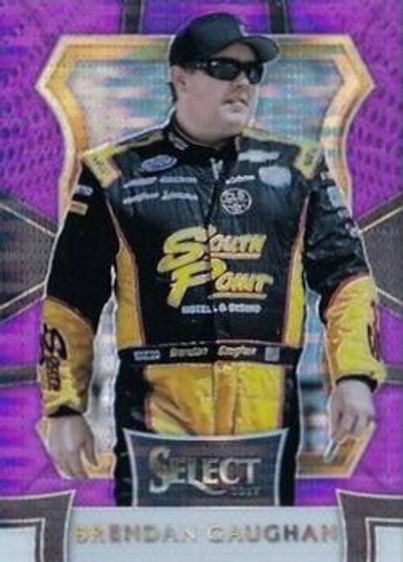 The Brendan Gaughan 2017 Select NASCAR #100 Purple Pulsar card is 1 of 16 Brendan Gaughan's card variations in the 2017 Select NASCAR set being tracked by Sports Card Investor, including Base, Silver, Red White & Blue Pulsar /299, Blue /199, and Red /99.
