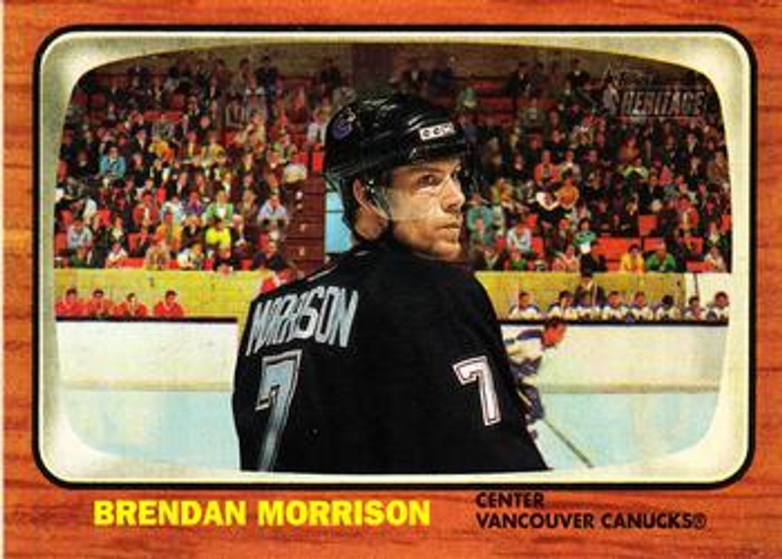 The Brendan Morrison 2002 Topps Heritage #57 Base card is 1 of 4 Brendan Morrison's card variations in the 2002 Topps Heritage set being tracked by Sports Card Investor, including Chrome Parallel /667, Great Skates, and Great Skates Patches.