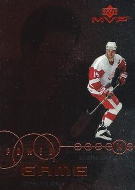 The Brendan Shanahan 1998 Upper Deck MVP #PG01 Power Game card is 1 of 8 Brendan Shanahan's card variations in the 1998 Upper Deck MVP set being tracked by Sports Card Investor, including Base, Silver Script, Gold Script /100, Super Script /25, and OT Heroes.