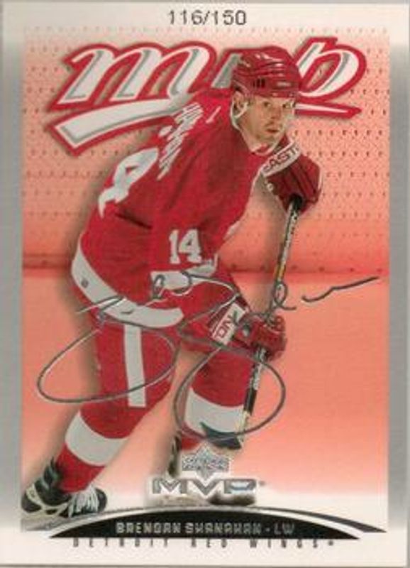 The Brendan Shanahan 2003 Upper Deck MVP #144 Silver Script /150 card is 1 of 5 Brendan Shanahan's card variations in the 2003 Upper Deck MVP set being tracked by Sports Card Investor, including Base, Gold Script /25, Red Script /25, and Threads Of Change /100.