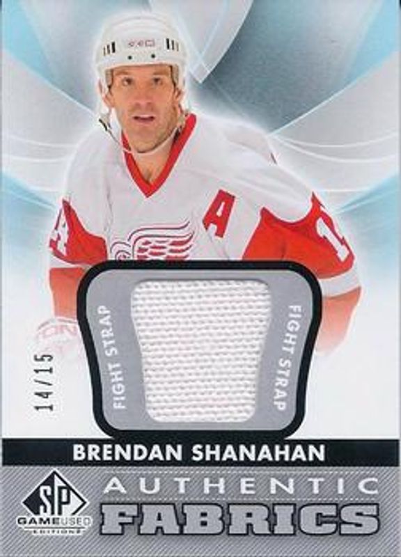 The Brendan Shanahan 2012 SP Game Used #AF-BS Authentic Fabrics Fight Straps /15 card is 1 of 7 Brendan Shanahan's card variations in the 2012 SP Game Used set being tracked by Sports Card Investor, including Authentic Fabrics, Authentic Fabrics Patches /35, Supreme Patches /12, Authentic Fabrics Gold /11, and Game Gear /3.
