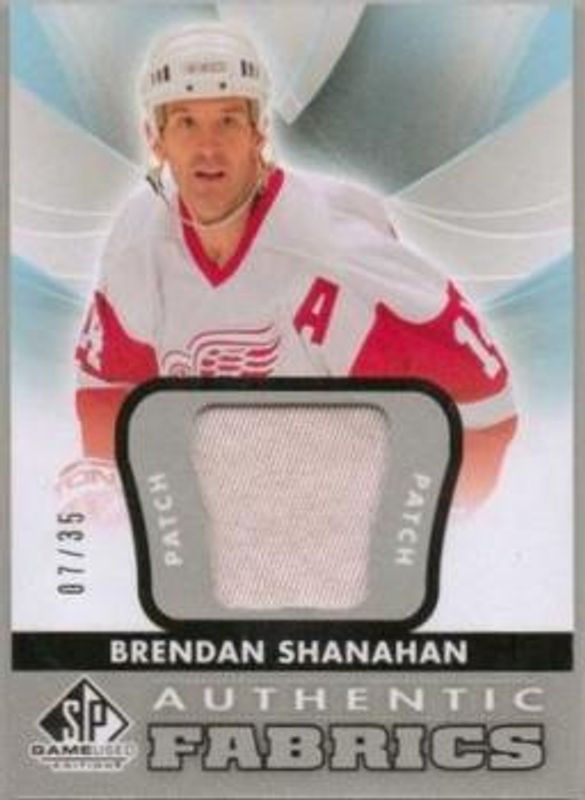 The Brendan Shanahan 2012 SP Game Used #AF-BS Authentic Fabrics Patches /35 card is 1 of 7 Brendan Shanahan's card variations in the 2012 SP Game Used set being tracked by Sports Card Investor, including Authentic Fabrics, Authentic Fabrics Fight Straps /15, Supreme Patches /12, Authentic Fabrics Gold /11, and Game Gear /3.