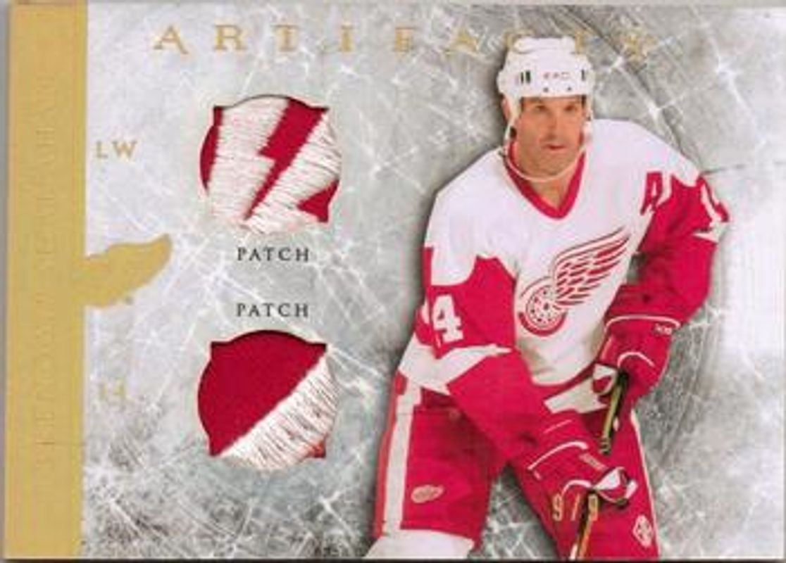 The Brendan Shanahan 2012 Upper Deck Artifacts #7 Jersey Patch Gold Spectrum Horizontal /9 card is 1 of 16 Brendan Shanahan's card variations in the 2012 Upper Deck Artifacts set being tracked by Sports Card Investor, including Base /699, Emerald /99, Sapphire /85, Gold Spectrum /25, and Black /5.