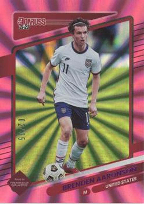 The Brenden Aaronson 2021 Donruss #165 Holo Pink Laser /25 Rookie card is 1 of 25 Brenden Aaronson's card variations in the 2021 Donruss set being tracked by Sports Card Investor, including Base, Holo Green Laser, Holo Orange Laser, Press Proof Gold /349, and Press Proof Purple /199.