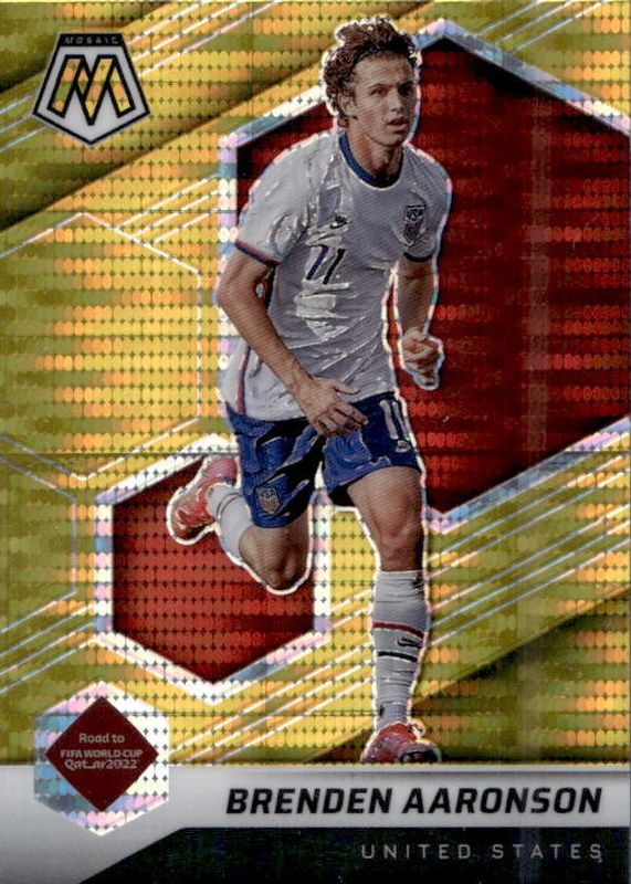 The Brenden Aaronson 2021 Mosaic Road to FIFA World Cup #102 Gold Pulsar Rookie card in Raw condition has not changed in price in the last 30 days and was last sold for $17.37 .