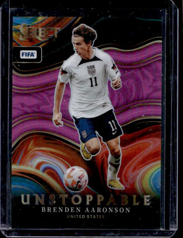 The Brenden Aaronson 2022 Select FIFA #17 Unstoppable Pink /25 card is 1 of 45 Brenden Aaronson's card variations in the 2022 Select FIFA set being tracked by Sports Card Investor, including #244 Base, #178 Base, #178 Blue, #244 Blue, and #178 Checkerboard.