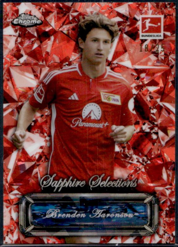 The Brenden Aaronson 2023 Topps Chrome Bundesliga Sapphire Edition #SSE-02 Sapphire Selections - Orange Refractor /25 card is 1 of 28 Brenden Aaronson's card variations in the 2023 Topps Chrome Bundesliga Sapphire Edition set being tracked by Sports Card Investor, including Base, Gold /50, Orange /25, Black /10, and Red /5.