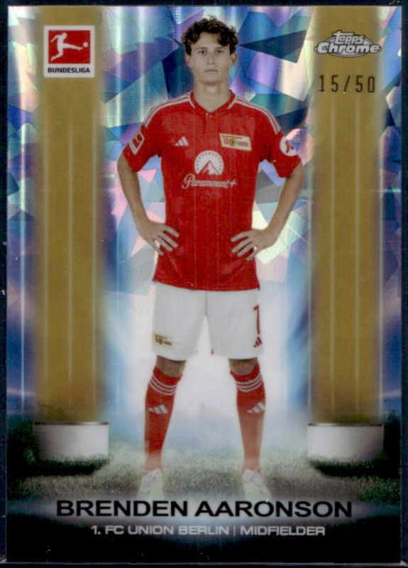 The Brenden Aaronson 2023 Topps Chrome Bundesliga Sapphire Edition #UB-1 Ultrabeam - Gold /50 card is 1 of 28 Brenden Aaronson's card variations in the 2023 Topps Chrome Bundesliga Sapphire Edition set being tracked by Sports Card Investor, including Base, Gold /50, Orange /25, Black /10, and Red /5.