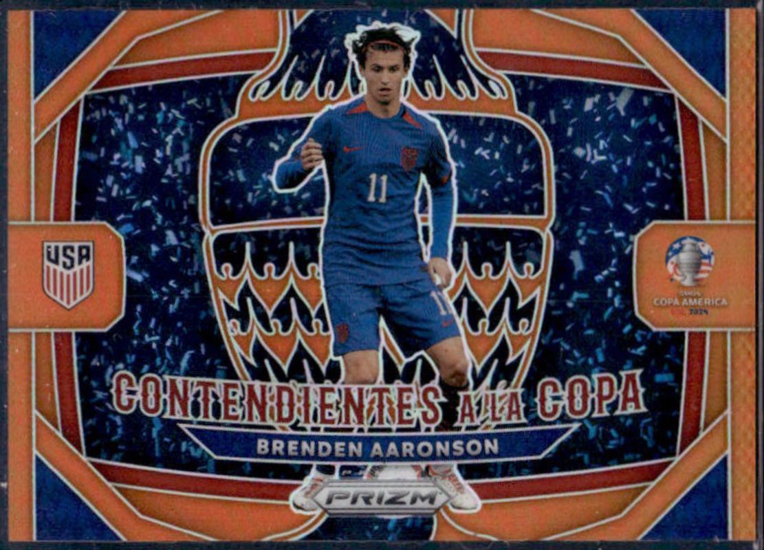 The Brenden Aaronson 2024 Prizm Copa America #22 Contendientes a la Copa - Orange /25 card is 1 of 47 Brenden Aaronson's card variations in the 2024 Prizm Copa America set being tracked by Sports Card Investor, including Base, Green Ice, Green Wave, Hyper, and Ice.