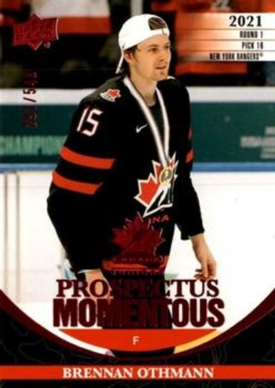 The Brennan Othmann 2023 Upper Deck Team Canada Juniors #PM-42 Prospectus Momentous - Electric Red /549 card is 1 of 85 Brennan Othmann's card variations in the 2023 Upper Deck Team Canada Juniors set being tracked by Sports Card Investor, including #66 Base, #137 Base, #4 Base, #66 Clear Cut, and #4 Clear Cut.