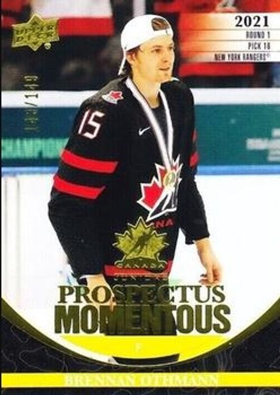 The Brennan Othmann 2023 Upper Deck Team Canada Juniors #PM-42 Prospectus Momentous - Electric Yellow /149 card is 1 of 85 Brennan Othmann's card variations in the 2023 Upper Deck Team Canada Juniors set being tracked by Sports Card Investor, including #66 Base, #137 Base, #4 Base, #66 Clear Cut, and #4 Clear Cut.