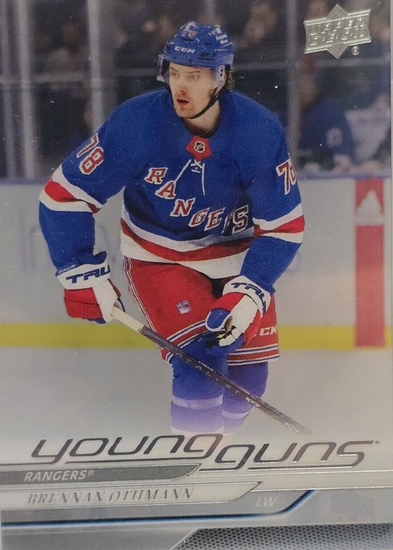 This card is 1 of 8 Brennan Othmann's card variations in the 2024 Upper Deck set being tracked by Sports Card Investor, including Young Guns Base, Young Guns - Outburst Silver, Young Guns - Deluxe /250, Young Guns - UD Exclusives /100, and Young Guns - Outburst Red /25.