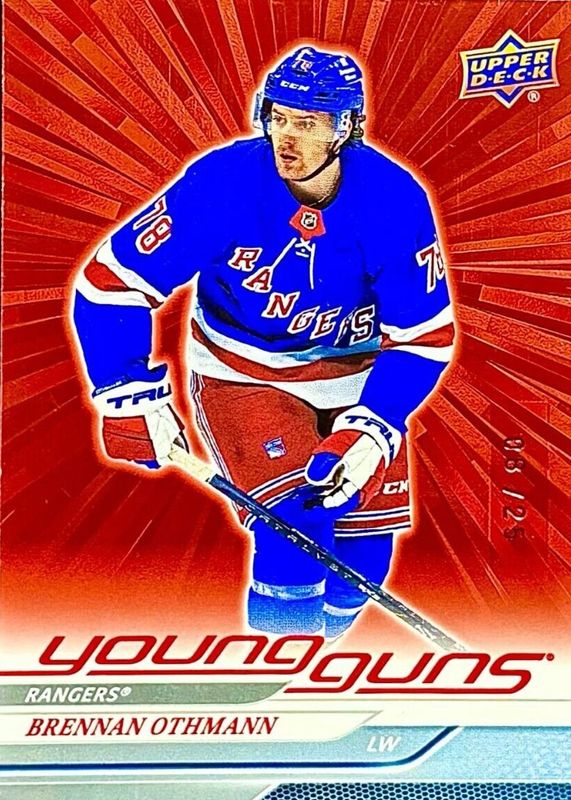 This card is 1 of 8 Brennan Othmann's card variations in the 2024 Upper Deck set being tracked by Sports Card Investor, including Young Guns Base, Young Guns - Clear Cut, Young Guns - Outburst Silver, Young Guns - Deluxe /250, and Young Guns - UD Exclusives /100.