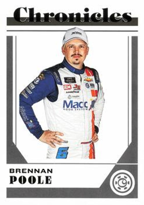 The Brennan Poole 2023 Chronicles NASCAR #8 Base card is 1 of 25 Brennan Poole's card variations in the 2023 Chronicles NASCAR set being tracked by Sports Card Investor, including Blue /199, Red /99, Purple /25, Gold /10, and Black /1.
