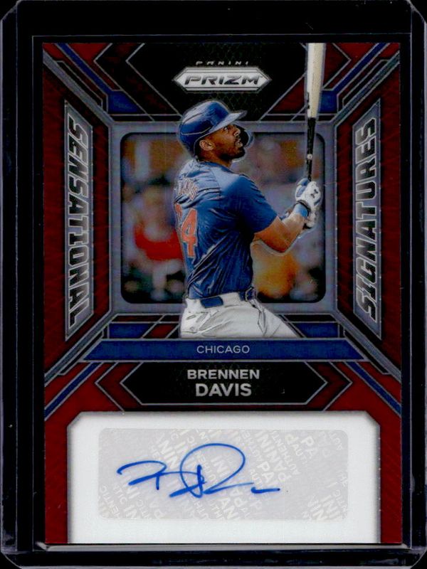 The Brennen Davis 2024 Prizm #SS-BD Sensational Signatures - Red /99 card is 1 of 12 Brennen Davis' card variations in the 2024 Prizm set being tracked by Sports Card Investor, including Sensational Signatures, Sensational Signatures - Green, Sensational Signatures - Pulsar /199, Sensational Signatures - Blue /49, and Sensational Signatures - Green Pulsar /25.