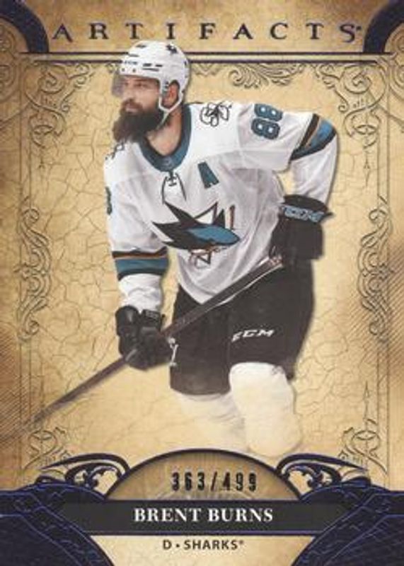 The Brent Burns 2020 Upper Deck Artifacts #46 Blue Sapphire /499 card is 1 of 16 Brent Burns' card variations in the 2020 Upper Deck Artifacts set being tracked by Sports Card Investor, including Base /999, Copper /299, Emerald /99, Autumn /75, and Aqua /45.