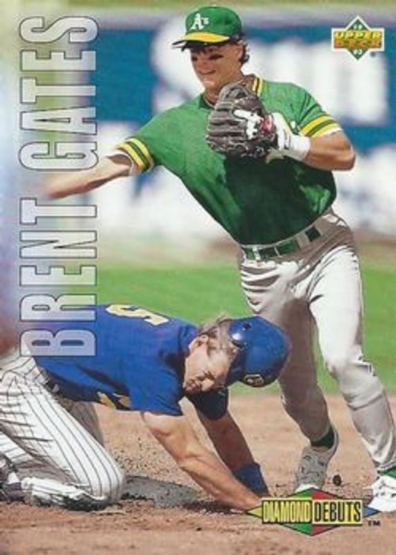 The Brent Gates 1993 Upper Deck #504 Base Rookie card is 1 of 3 Brent Gates' card variations in the 1993 Upper Deck set being tracked by Sports Card Investor, including Base, and Gold Hologram.