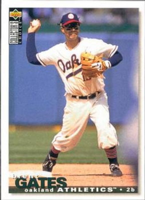 The Brent Gates 1995 Upper Deck Collector's Choice #124 Base card is 1 of 3 Brent Gates' card variations in the 1995 Upper Deck Collector's Choice set being tracked by Sports Card Investor, including Gold Signatures, and Silver Signatures.