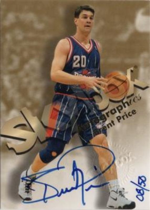 The Brent Price 1998 Skybox Premium Autographics Blue /50 card is 1 of 4 Brent Price's card variations in the 1998 Skybox Premium set being tracked by Sports Card Investor, including Base, Star Rubies /50, and Autographics.