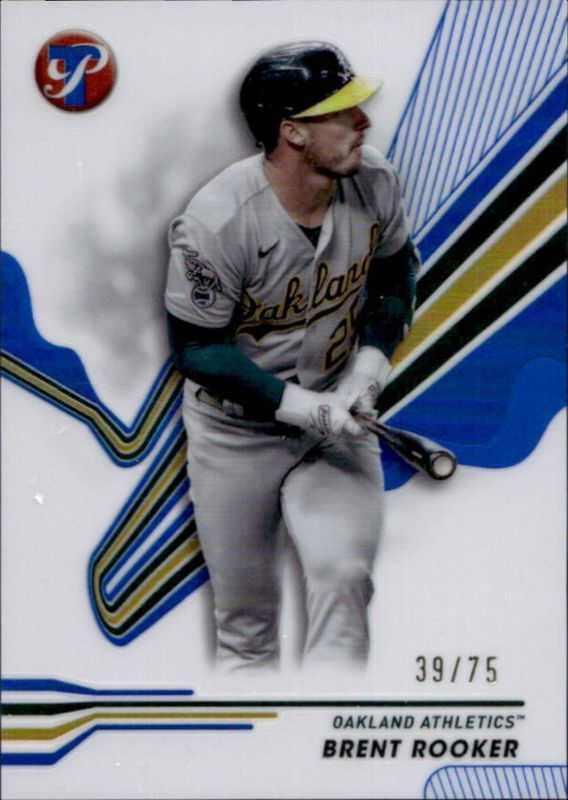 The Brent Rooker 2024 Topps Pristine #188 Blue Refractor /75 card is 1 of 36 Brent Rooker's card variations in the 2024 Topps Pristine set being tracked by Sports Card Investor, including #266 Base, #188 Base, #266 Pristine Refractor, #188 Pristine Refractor, and #188 Refractor.