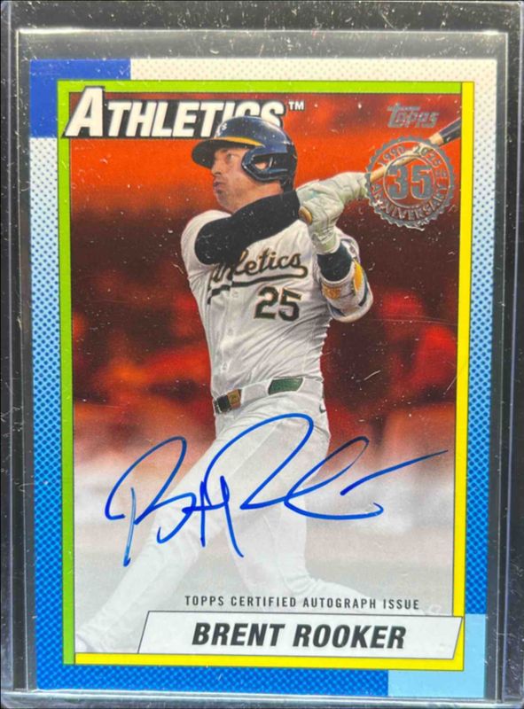 The Brent Rooker 2025 Topps #90B2-BRO 1990 Baseball Autographs (Series 2) - Orange /25 card is 1 of 117 Brent Rooker's card variations in the 2025 Topps set being tracked by Sports Card Investor, including Base, Aqua Holo Foil, Diamante Foil, Holo Foil, and Pink Diamante Foil.