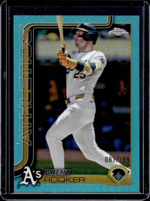 The Brent Rooker 2025 Topps Chrome #54 Aqua Refractor /199 card is 1 of 72 Brent Rooker's card variations in the 2025 Topps Chrome set being tracked by Sports Card Investor, including Base, Geometric Refractor, Image Variation, Lightboard Logo Variation, and Negative Refractor.
