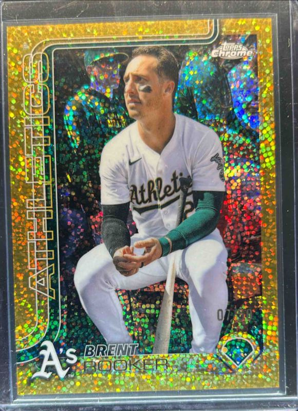 The Brent Rooker 2025 Topps Chrome #54 Base Image Variation - Gold Speckle Refractor /50 card is 1 of 72 Brent Rooker's card variations in the 2025 Topps Chrome set being tracked by Sports Card Investor, including Base, Geometric Refractor, Image Variation, Lightboard Logo Variation, and Negative Refractor.