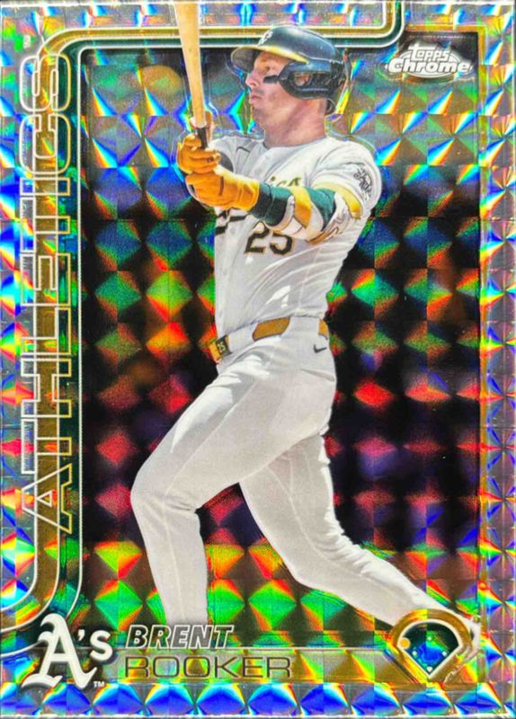 The Brent Rooker 2025 Topps Chrome #54 Geometric Refractor card is 1 of 72 Brent Rooker's card variations in the 2025 Topps Chrome set being tracked by Sports Card Investor, including Base, Image Variation, Lightboard Logo Variation, Negative Refractor, and Prism Refractor.