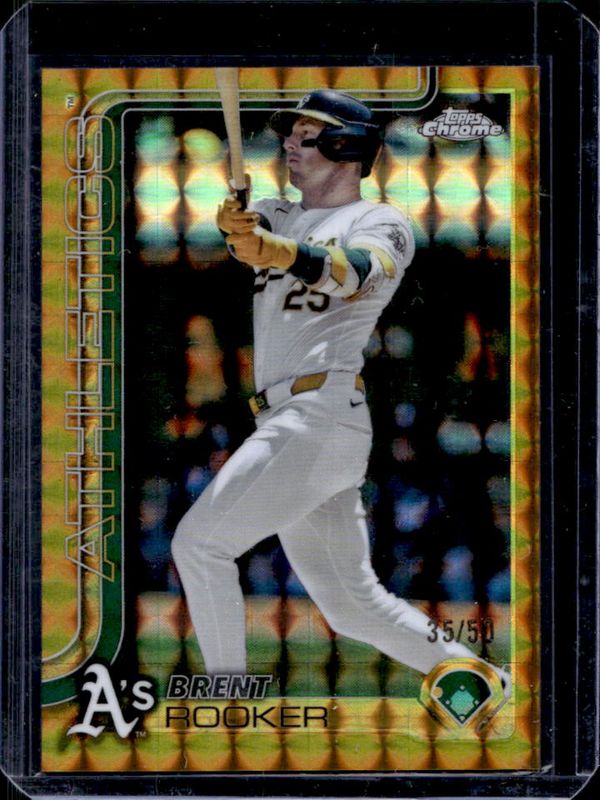 The Brent Rooker 2025 Topps Chrome #54 Gold Geometric Refractor /50 card is 1 of 72 Brent Rooker's card variations in the 2025 Topps Chrome set being tracked by Sports Card Investor, including Base, Geometric Refractor, Image Variation, Lightboard Logo Variation, and Negative Refractor.