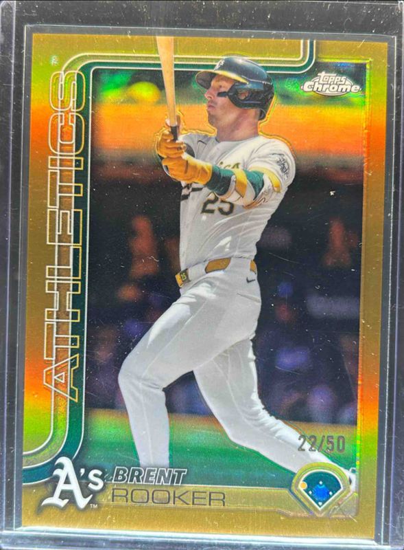 The Brent Rooker 2025 Topps Chrome #54 Gold Refractor /50 card is 1 of 72 Brent Rooker's card variations in the 2025 Topps Chrome set being tracked by Sports Card Investor, including Base, Geometric Refractor, Image Variation, Lightboard Logo Variation, and Negative Refractor.