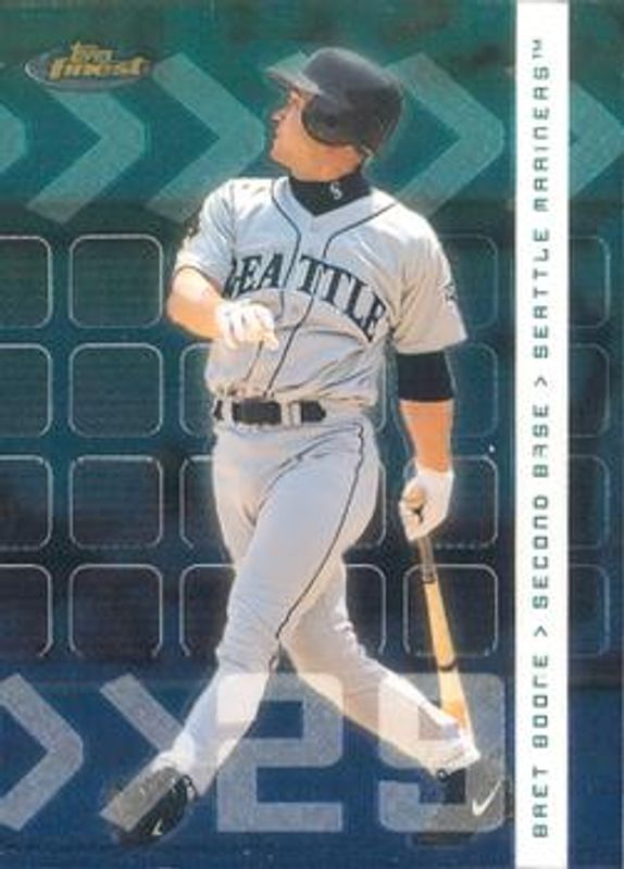 The Bret Boone 2002 Topps Finest #94 Base card is 1 of 5 Bret Boone's card variations in the 2002 Topps Finest set being tracked by Sports Card Investor, including Refractor /499, Bat Relics, Jersey Relics, and X-Fractor /299.