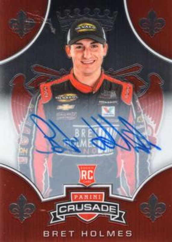 The Bret Holmes 2020 Chronicles NASCAR #5 Crusade Autographs /99 card is 1 of 26 Bret Holmes' card variations in the 2020 Chronicles NASCAR set being tracked by Sports Card Investor, including Ascension, Crusade, Crusade Holo, Spectra, and Ascension Autographs /199.