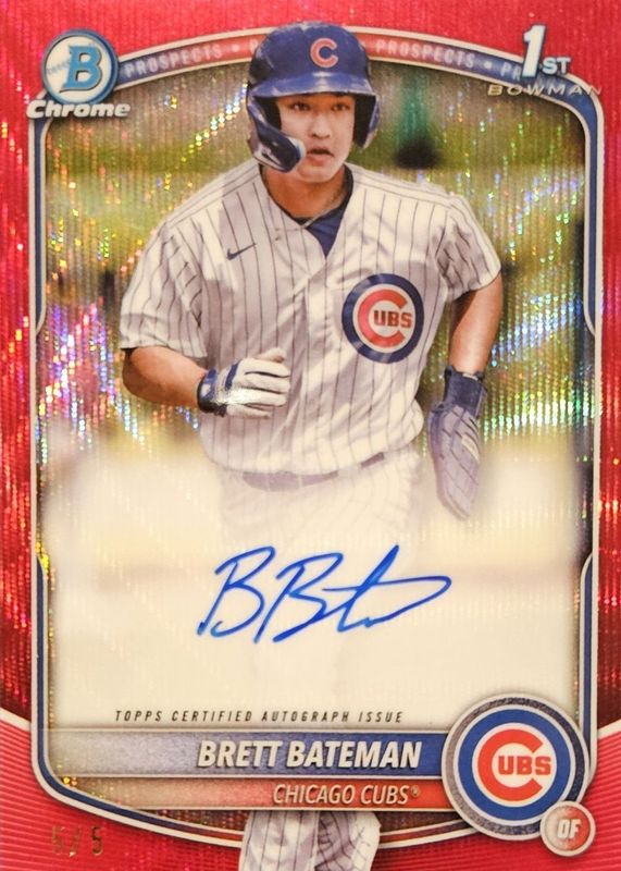 The Brett Bateman 2025 Bowman Chrome #CPA-BBA Prospect Auto - Red Wave Refractor /5 (1st) card in Raw condition has not changed in price in the last 30 days and was last sold for $148.33 .
