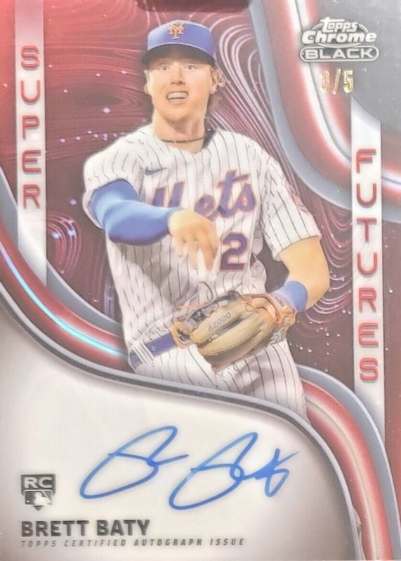 The Brett Baty 2023 Topps Chrome #RA-BBA Rookie Autographs - Red Refractor /5 card in Raw condition has not changed in price in the last 30 days and was last sold for $57.00 .