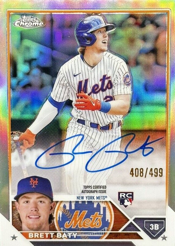 The Brett Baty 2023 Topps Chrome #RA-BBA Rookie Autographs - Refractor /499 card in Raw condition has moved up $2.00 (+10.0%) in the last 30 days and was last sold for $22.00 .