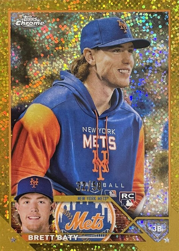 The Brett Baty 2023 Topps Chrome #204 SP Variation - Gold Speckle Refractor /50 (Wearing Hoodie) Rookie card in Raw condition has not changed in price in the last 30 days and was last sold for $90.00 .