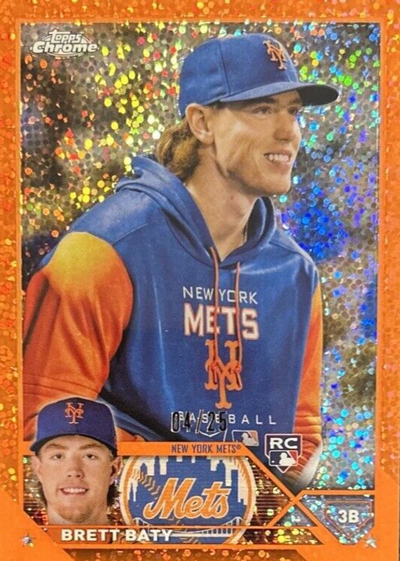 The Brett Baty 2023 Topps Chrome #204 SP Variation - Orange Speckle Refractor /25 (Wearing Hoodie) Rookie card in Raw condition has not changed in price in the last 30 days and was last sold for $23.50 .