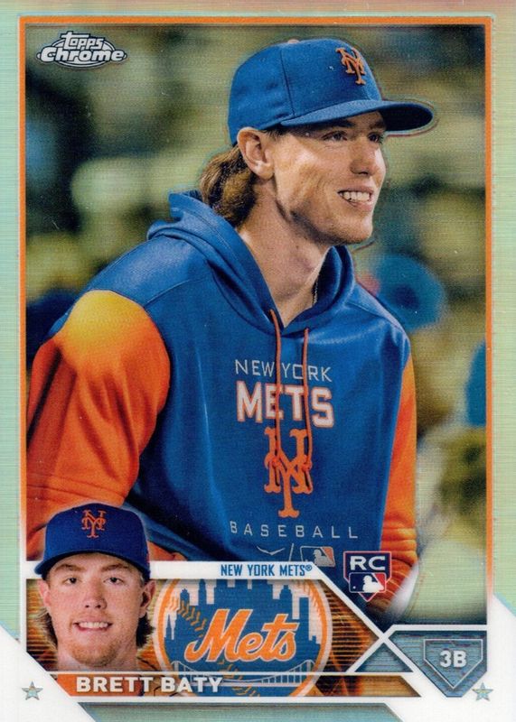 The Brett Baty 2023 Topps Chrome #204 SP Variation (Wearing Hoodie) Rookie card in Raw condition has moved up $3.00 (+60.0%) in the last 30 days and was last sold for $8.00 .