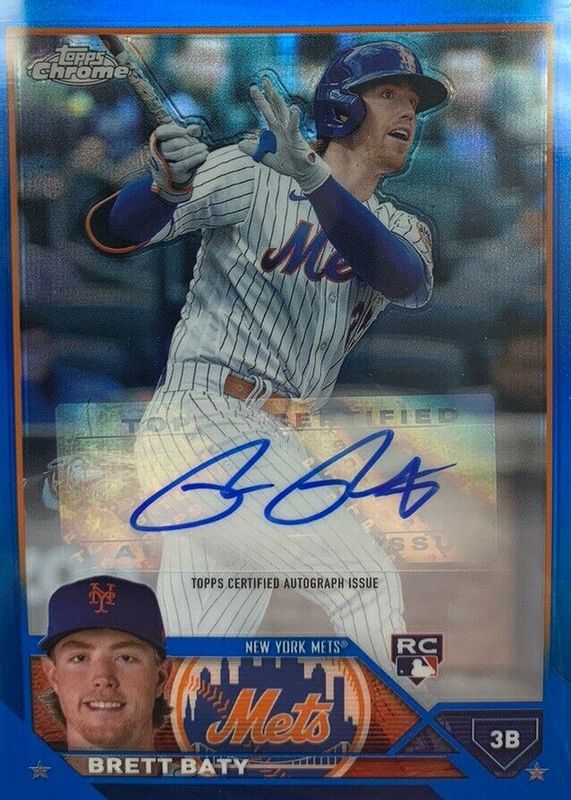 The Brett Baty 2023 Topps Chrome Update #AC-BBA Autographs - Blue Refractor /150 Rookie card in Raw condition has not changed in price in the last 30 days and was last sold for $22.50 .