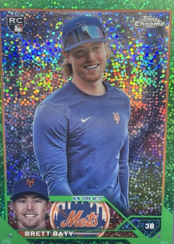 The Brett Baty 2023 Topps Chrome Update #USC10 Rookie Debut - Green Refractor /99 card in Raw condition has not changed in price in the last 30 days and was last sold for $1.25 .