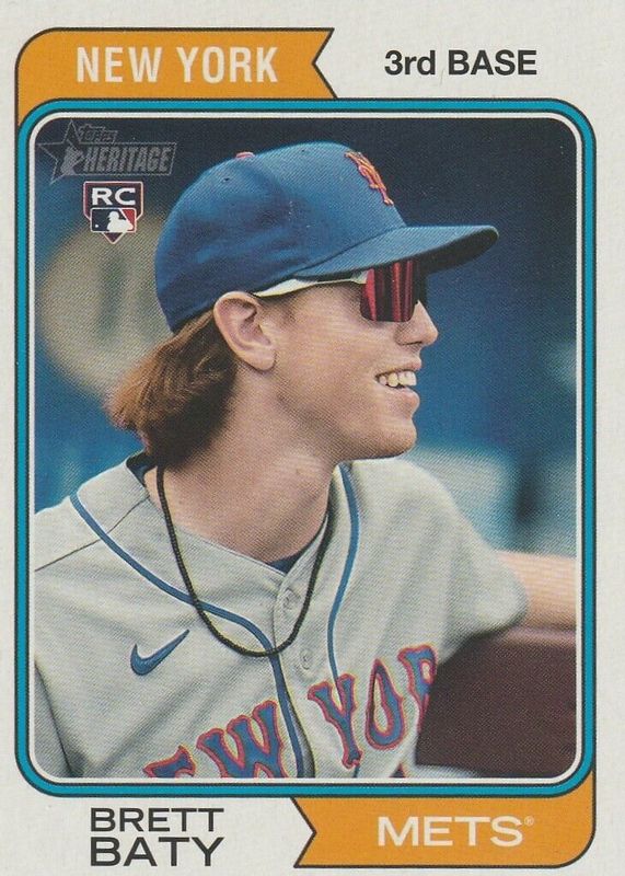 This card is 1 of 5 Brett Baty's card variations in the 2023 Topps Heritage set being tracked by Sports Card Investor, including Image Variation (Red Shirt), Name Position Swap Variation, Real One Autographs, and Real One Autographs - Red Ink /74.