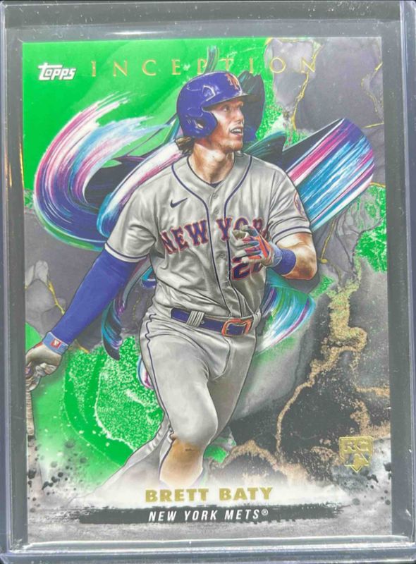 The Brett Baty 2023 Topps Inception #13 Green Rookie card is 1 of 36 Brett Baty's card variations in the 2023 Topps Inception set being tracked by Sports Card Investor, including Base, Purple /150, Magenta /99, Red /75, and Orange /50.