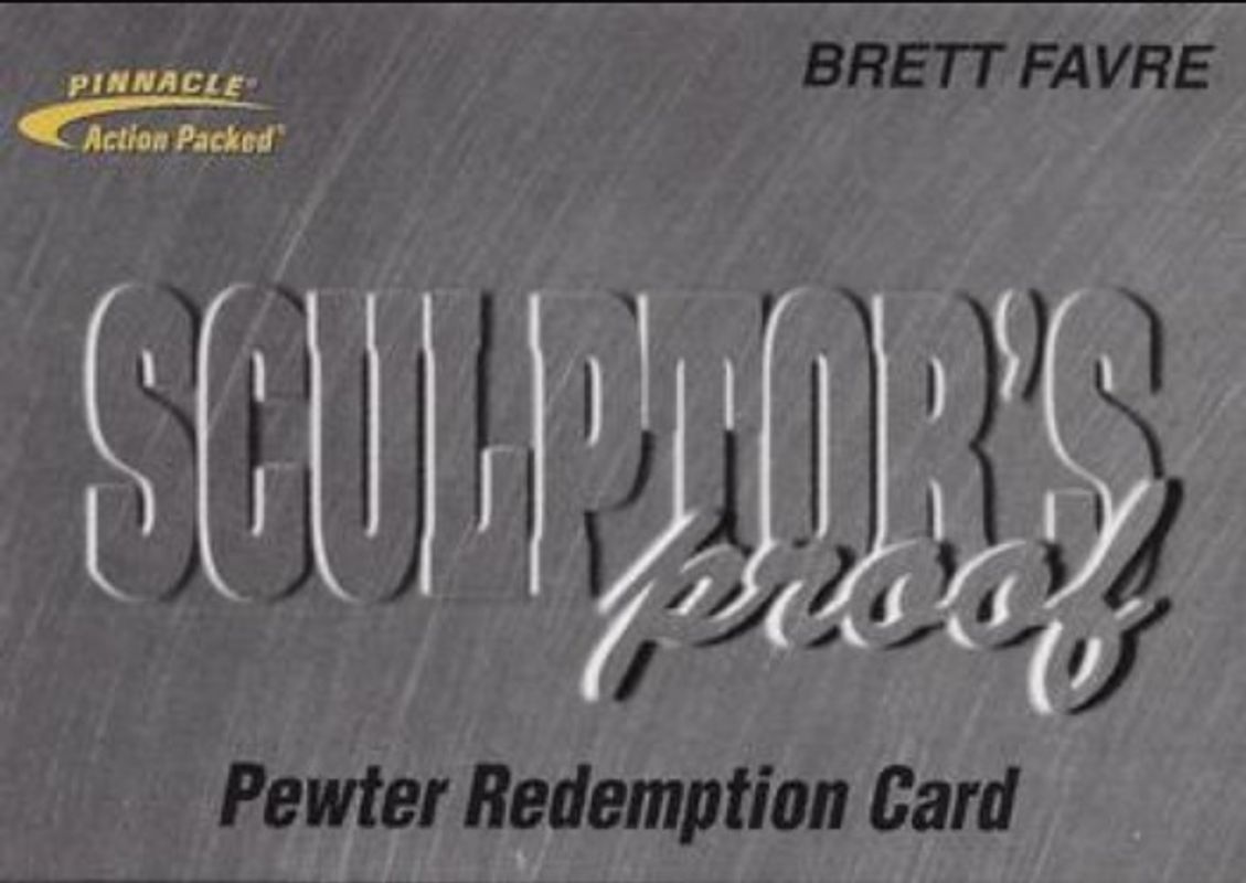 The Brett Favre 1996 Action Packed Flagship #4 Sculptor's Proof Redemption Card card is 1 of 6 Brett Favre's card variations in the 1996 Action Packed Flagship set being tracked by Sports Card Investor, including Base, Artist's Proofs, 24kt Gold, Jumbos, and Sculptor's Proof.