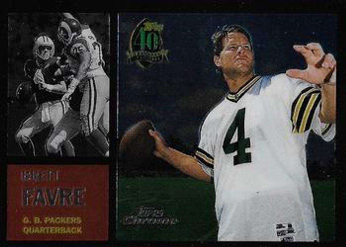 The Brett Favre 1996 Topps Chrome #7 40th Anniversary Retros card is 1 of 7 Brett Favre's card variations in the 1996 Topps Chrome set being tracked by Sports Card Investor, including #131 Base, #145 Base, #131 3,000 Yard Club - Refractor, #145 Refractor, and #131 Refractor.