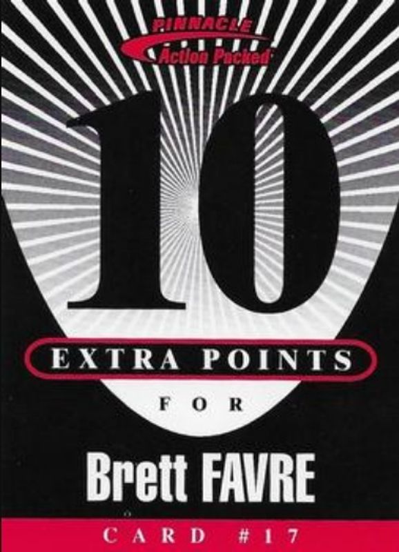 The Brett Favre 1997 Action Packed Flagship #17 Extra Points 10 card is 1 of 11 Brett Favre's card variations in the 1997 Action Packed Flagship set being tracked by Sports Card Investor, including #17 Base, #111 Base, #17 First Impressions, #111 First Impressions, and #111 Gold Impressions.