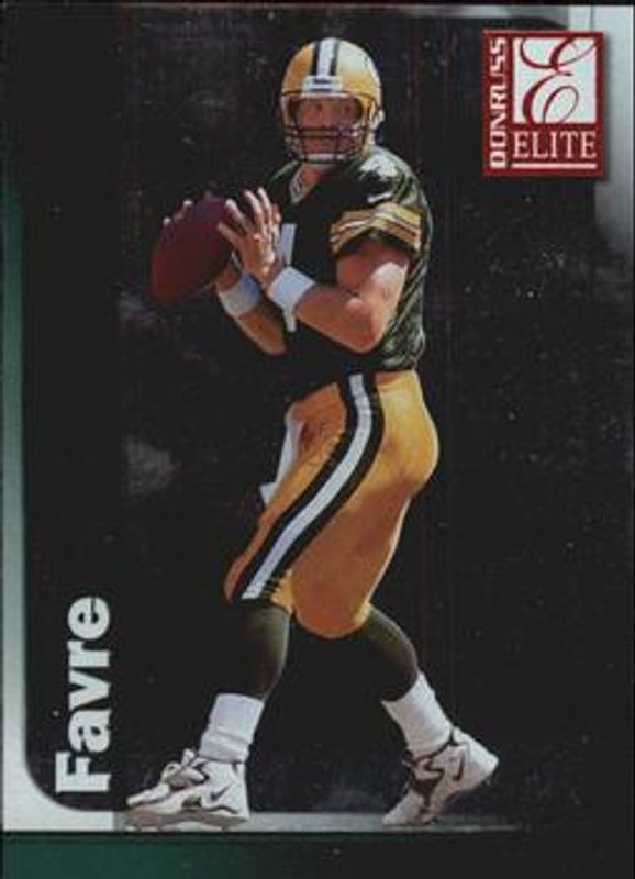 The Brett Favre 1999 Donruss Elite #004 Base card is 1 of 16 Brett Favre's card variations in the 1999 Donruss Elite set being tracked by Sports Card Investor, including Aspirations /72, Status /28, Power Formulas /3500, Primary Colors - Yellow /1875, and Field of Vision /1712.