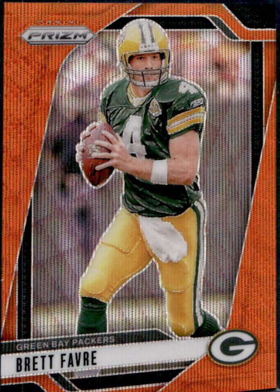 The Brett Favre 2024 Prizm #110 Orange Wave /60 card is 1 of 97 Brett Favre's card variations in the 2024 Prizm set being tracked by Sports Card Investor, including Base, Choice Blue Yellow Green, Choice Silver, Disco, and Green.