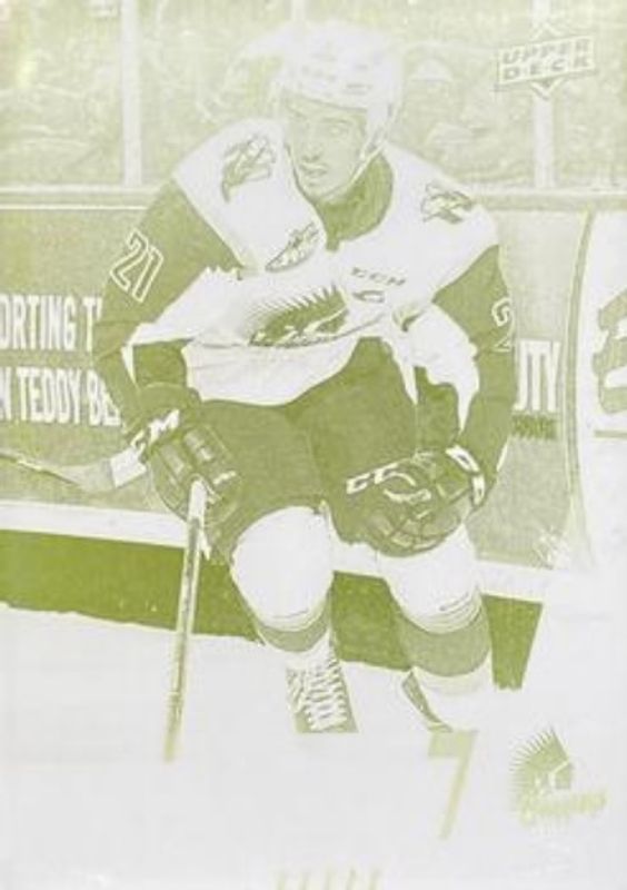 The Brett Howden 2017 Upper Deck CHL #70 Printing Plates Yellow /1 card is 1 of 8 Brett Howden's card variations in the 2017 Upper Deck CHL set being tracked by Sports Card Investor, including Base, Rainbow, Red Bordered, Printing Plates Black /1, and Printing Plates Cyan /1.