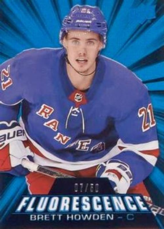 The Brett Howden 2018 Upper Deck #F-37 Fluorescence - Blue /50 Rookie card is 1 of 28 Brett Howden's card variations in the 2018 Upper Deck set being tracked by Sports Card Investor, including Young Guns Base, Young Guns Canvas, Young Guns - Clear Cut, Young Guns - Jumbo, and Young Guns - Silver Foil.