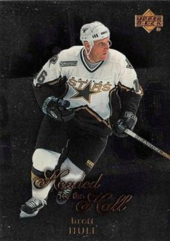 The Brett Hull 1999 Upper Deck #HOF-6 Headed for the Hall card is 1 of 28 Brett Hull's card variations in the 1999 Upper Deck set being tracked by Sports Card Investor, including #43 Base, #144 Base, #43 UD Exclusives /100, #144 UD Exclusives /100, and #144 UD Exclusives 1/1 /1.